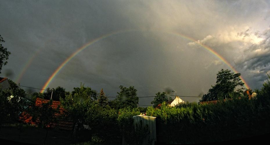 Das einzig sichere ist der sonnige Abend. Bisher ist sich noch immer ein Sonnenuntergang ausgegangen. Dann klart es auch auf, damit es eine möglichst kalte Nacht wird. Das ganze läuft im Prinzip wie folgt ab: Das letzte Gewitter verzieht sich und läßt einen hübschen Regenbogen zurück: