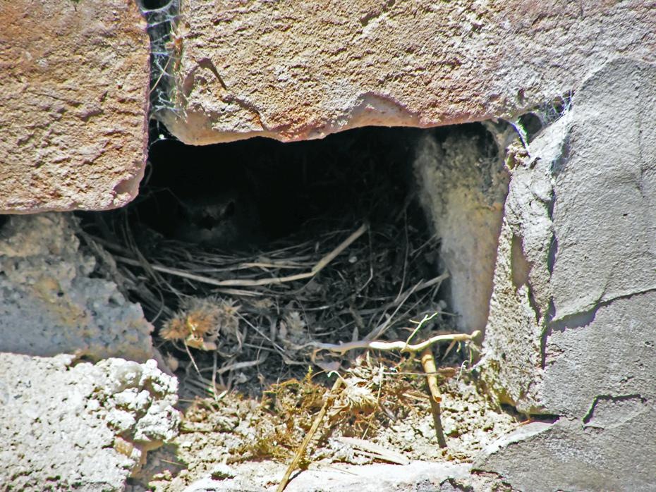 Jedenfalls sind die alten Hausmauern noch auf der Rückseite und zum Teil auf der rechten Seite erhalten; jetzt halt als Stützwände. In diesen alten Ziegelmauern sind Löcher, keine Ahnung wofür man die früher gebraucht hat. Jedenfalls – und nun komme ich zum Kern der Geschichte – hat dieses Jahr ein Vogel eines dieser Löcher als besonders günstig für die Aufzucht seiner Jungen erachtet und dort sein Nest gebaut. Weil dieser Vogel aber extrem scheu ist, kann ich noch nicht einmal sagen was es für ein Vogel ist. Immer wenn ich mich anschleiche, zischt er heraus. Und das mit einem derartigen Höllentempo, daß ich nicht die geringste Chance habe, genaueres zu sehen.