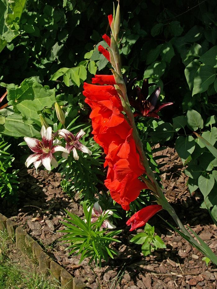 Im letzten Bericht habe ich die Schwebfliege auf meinen Gladiolen gezeigt. Aber ich hab die Gladiolen gar nicht als Ganzes gezeigt. Diesen Mangel muß ich gleich nachbessern: