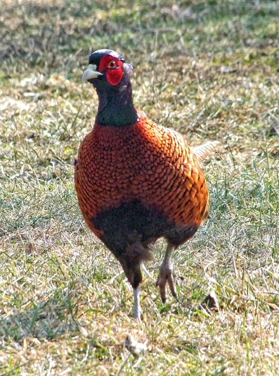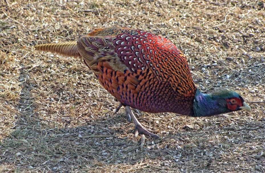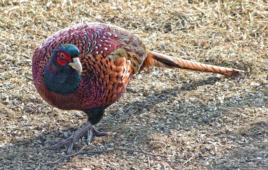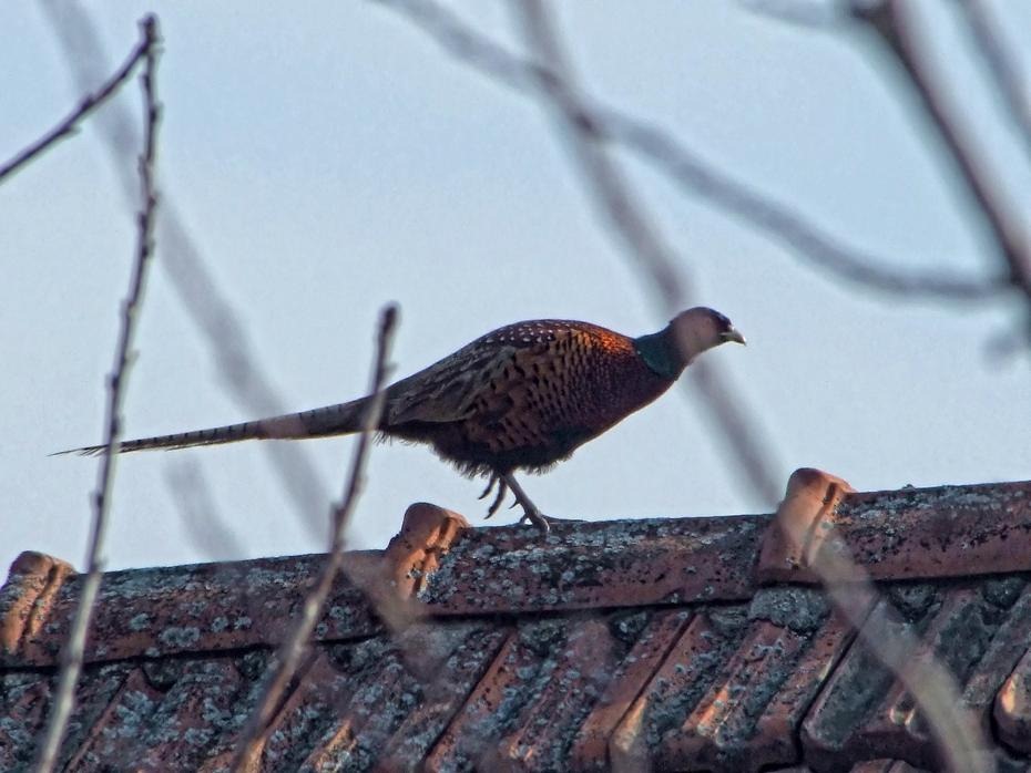 Wie ich heute so aus dem Fenster schaue, sehe ich am Dachfirst meines Nachbar einen Fasan rumstehen. Er schaut sich um und beobachtet meinen Garten. Das geht ein paar Minuten so. Dann bewegt er sich am First entlang auf mein Dach zu: