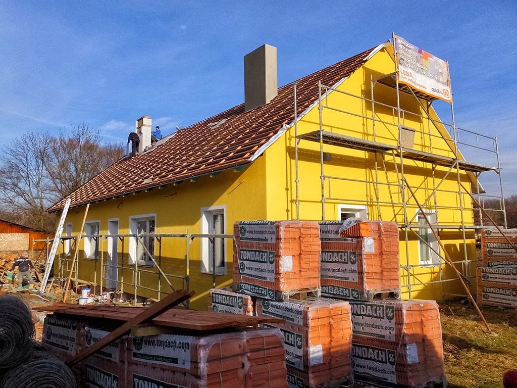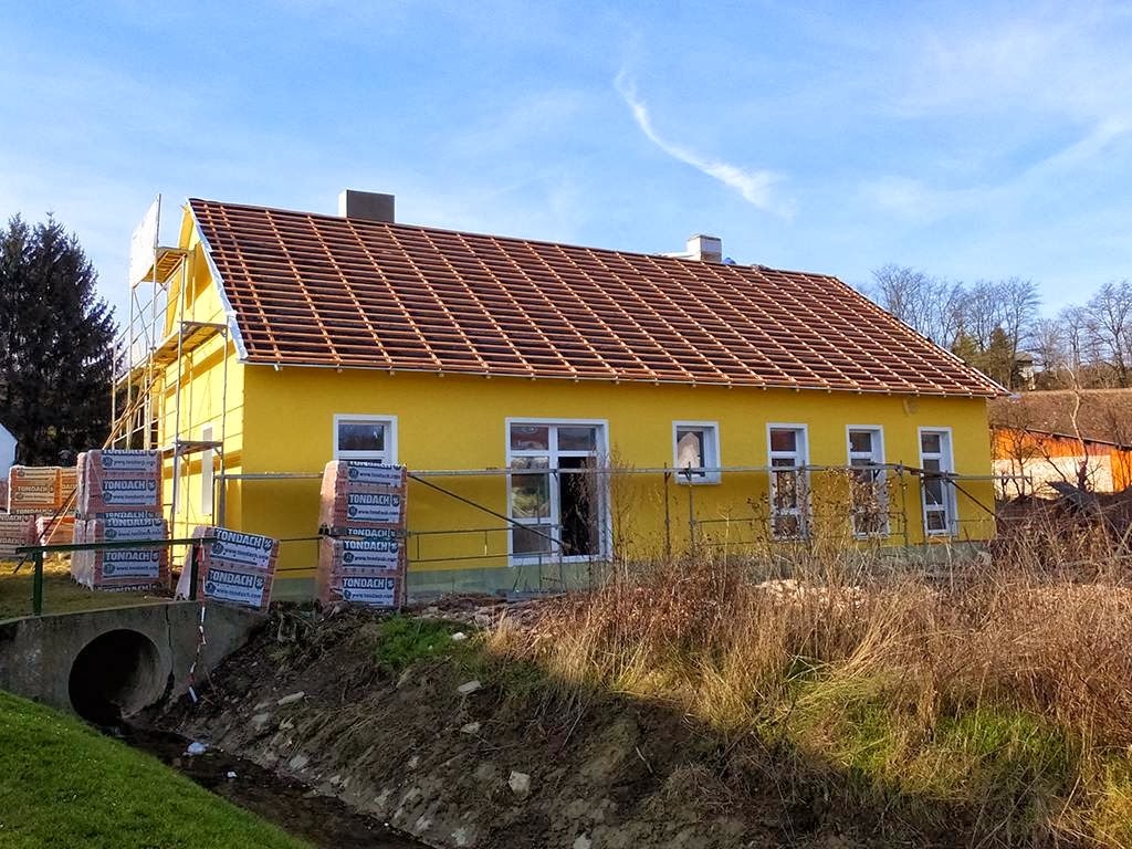 Die Arbeiter leisten super Arbeit in flottem Tempo: Nur eine Woche später ist der Dachstuhl komplett, die Folie drauf und auch schon alle Dachlatten prangen am Dach. Was will man mehr?