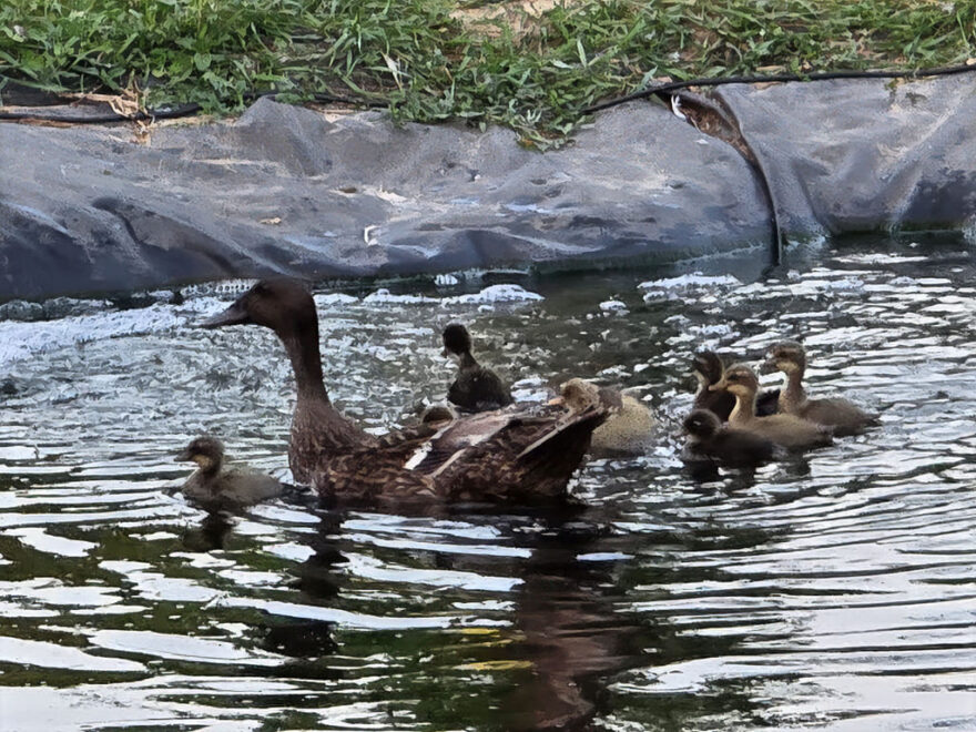 Ganz entgegen der sonstigen Enten-Gewohnheiten ist die Entenmamma sehr aufmerksam, führt ihre Kleinen sehr streng am Flügel (da wandelt keiner einmal so weg) und alle anderen Enten werden auf Abstand gehalten. Also gehört die Hälfte des Teichs ihr und den Rest müssen sich die anderen teilen.